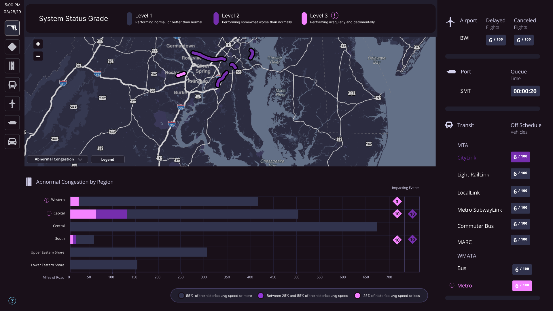 Project Description: Overview page for a multi-page dashboard summarizing the status of Maryland’s transportation system. The goal was to clearly highlight when conditions were out of the ordinary and required immediate attention. Designed for display on large-scale monitors as well as exploration on desktop, the dashboard is currently used in Maryland’s Lieutenant Governor’s office.
