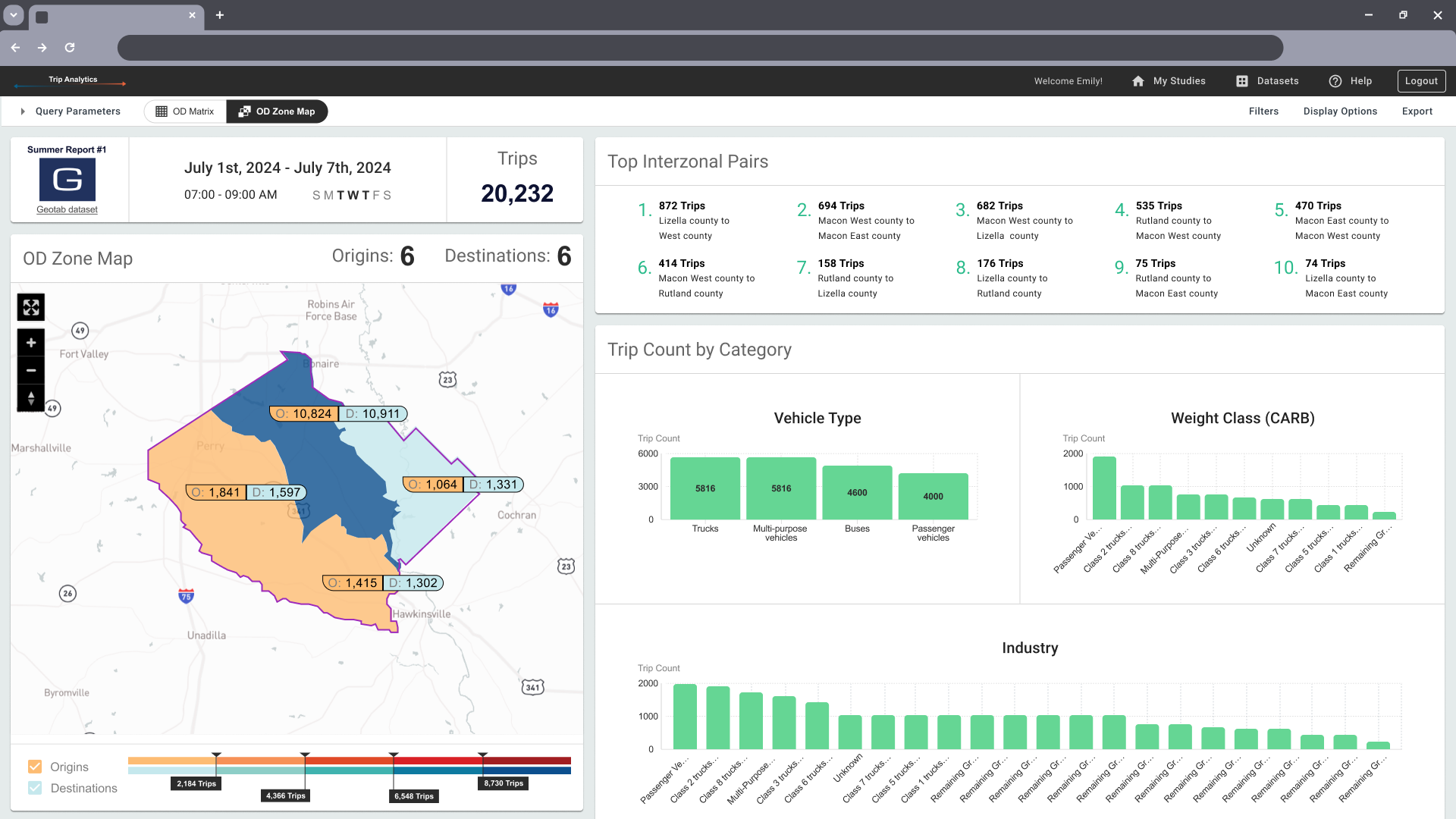 Project Description: Dashboard for a trucking dataset using trajectory data. Originally, the tool was map-based, but the client wanted a dashboard design showcasing multiple metrics for deeper analysis. The dashboard is primarily used for after-action analysis and research by a variety of government agencies, including the Departments of Transportation in Texas, Georgia, Nevada, and Massachusetts.